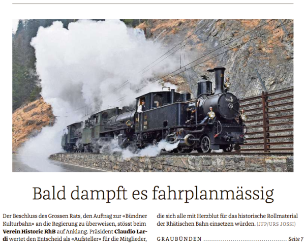 Die politische Diskussion geht weitert: Im heutigen«Bündner Tagblatt» erklärt Claudio Lardi, Präsident von historic RhB die Vision der «Bündner Erlebnisbahn».